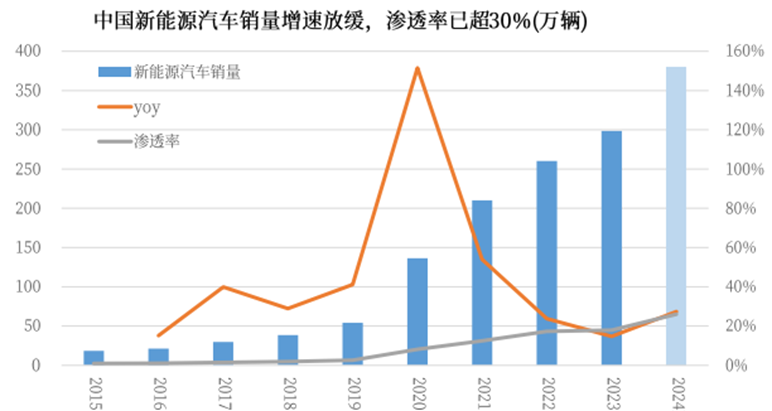 據(jù)中汽協(xié)數(shù)據(jù),2023全年中國新能源汽車車銷量達(dá)到949.5萬輛、同比+37.9%,較2021年(157.6%)和2022年(95.6%)增速大幅放緩,主要原因有二:2023全年和12月單月中國新能源汽車銷量滲透率達(dá)到31.6%和37.7%、年初至年末呈加速滲透,大基數(shù)和高增速下未來增長速率將回落;內(nèi)燃油車反撲性降價對新能源汽車銷量增長造成擠壓。