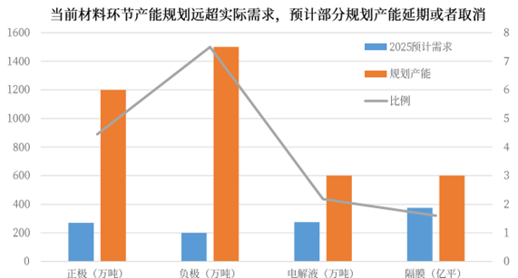 中游材料各環(huán)節(jié)新增產(chǎn)能推進(jìn)力度明顯減緩。行業(yè)研究報告數(shù)據(jù)顯示,2023Q1~3正極/負(fù)極/隔膜/電解液各環(huán)節(jié)上市公司構(gòu)建固定資產(chǎn)支付的現(xiàn)金的平均增速分別為-4.8%/-7.9%/+31.6%/+15.2%,較前兩年大幅降低。材料環(huán)節(jié)已公布產(chǎn)能規(guī)劃遠(yuǎn)超2025年全球需求。因此鋰電材料環(huán)節(jié)整體新增產(chǎn)能投放節(jié)奏或?qū)⒊掷m(xù)減緩,部分規(guī)劃產(chǎn)能將面臨延期或取消,其中電解液/隔膜環(huán)節(jié)相對格局更優(yōu)。