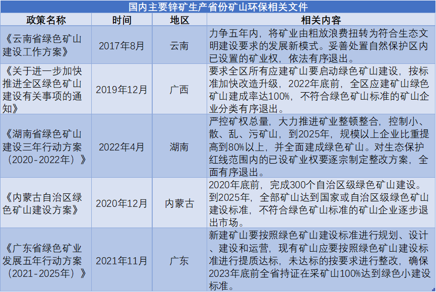 在省級層面各省為了響應(yīng)中央相關(guān)環(huán)保政策,先后出臺礦山建設(shè)標(biāo)準(zhǔn),對不合標(biāo)準(zhǔn)的礦山要求關(guān)閉退出。“綠色礦山”要求礦企配備相關(guān)環(huán)保設(shè)施否則不能開工,而中小型鋅礦資金實力較弱難以達標(biāo),這也是在2020年鋅礦利潤相對豐厚的前提下中小型鋅礦開工率卻出現(xiàn)加速下滑現(xiàn)象的原因之一。