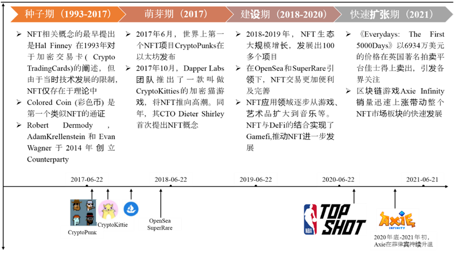 NFT相關(guān)概念最早于1993年由Hal Finney提出。直到2017年6月,世界上第一個(gè)NFT項(xiàng)目CryptoPunks才正式誕生,同年,一款叫Cryptokities的游戲?qū)FT概念推向高潮。