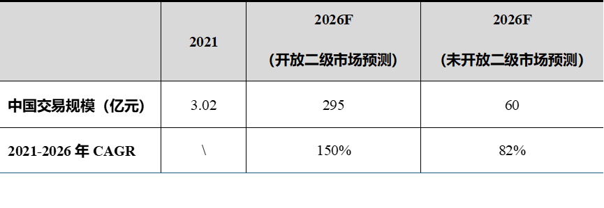 2021年中國NFT行業(yè)市場交易總規(guī)模超過3億元。目前中國的NFT市場仍然停留在一級市場,二次交易尚未放開。未來NFT市場,我們保守預(yù)測,屆時國內(nèi)仍未開放二級市場,到2026年,預(yù)計中國NFT市場規(guī)模約為60億;樂觀預(yù)測,若中國2023年能正式開放二級市場,到2026年市場規(guī)模將是未開放前的5倍,達(dá)到295億元。