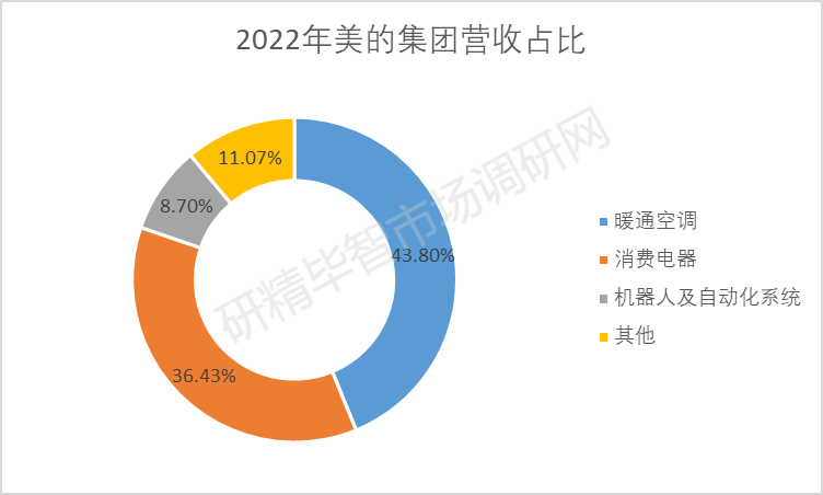 2022年主營產(chǎn)品包括暖通空調(diào)、消費(fèi)電器、機(jī)器人及自動(dòng)化系統(tǒng),占比分別為43.80%、36.43%、8.70%。