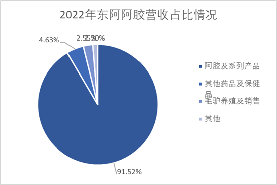 2023年前三季度實(shí)現(xiàn)營(yíng)業(yè)收入34.28億元,同比增長(zhǎng)12.54%;實(shí)現(xiàn)歸母凈利潤(rùn)7.84億元,同比增長(zhǎng)52.83%。2022年主營(yíng)產(chǎn)品包括阿膠及系列產(chǎn)品、其他藥品及保健品、毛驢養(yǎng)殖及銷售,分別占整體營(yíng)收的91.52%、4.63%、2.55%。