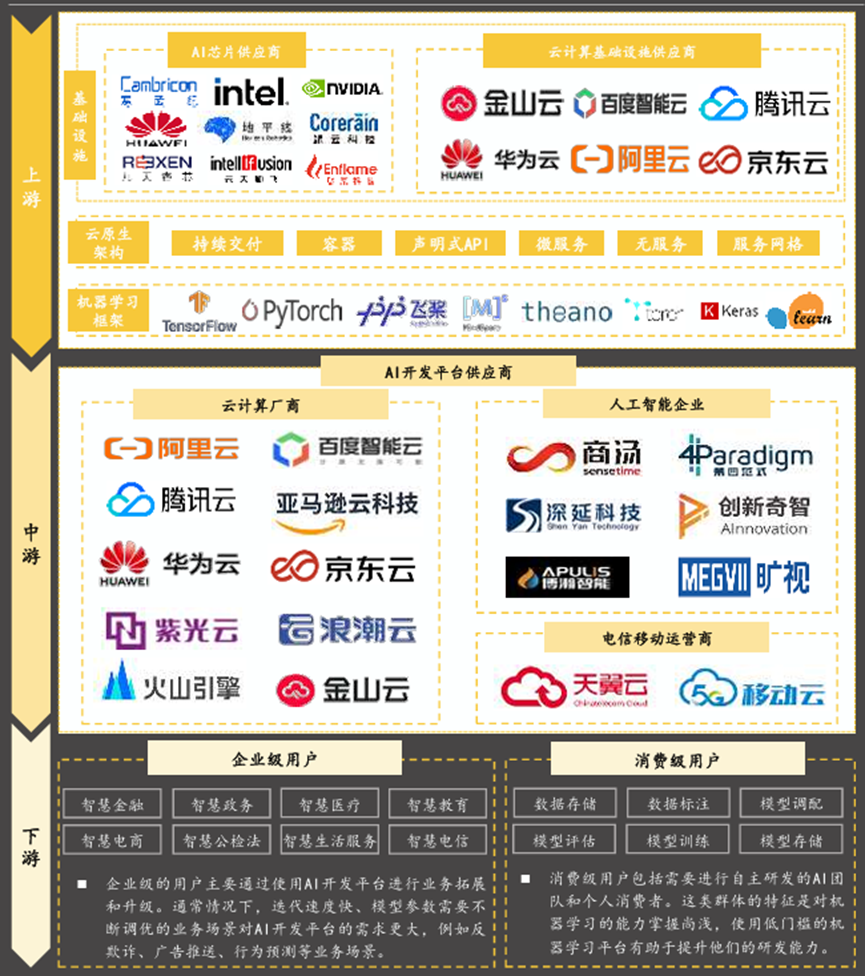 中國AI開發(fā)平臺(tái)的產(chǎn)業(yè)鏈上游為支撐AI開發(fā)平臺(tái)運(yùn)行的基礎(chǔ)設(shè)施組成,包括AI芯片、云服務(wù)、云原生架構(gòu)和機(jī)器學(xué)習(xí)框架;中游為提供AI開發(fā)平臺(tái)服務(wù)的云計(jì)算廠商和人工智能企業(yè)以及網(wǎng)絡(luò)運(yùn)營商,涉及到的企業(yè)有金山云、華為、騰訊云、商湯科技等;下游為使用AI開發(fā)平臺(tái)的企業(yè)級(jí)和消費(fèi)級(jí)用戶,主要應(yīng)用在智慧金融、智慧教育、智慧醫(yī)療等領(lǐng)域。