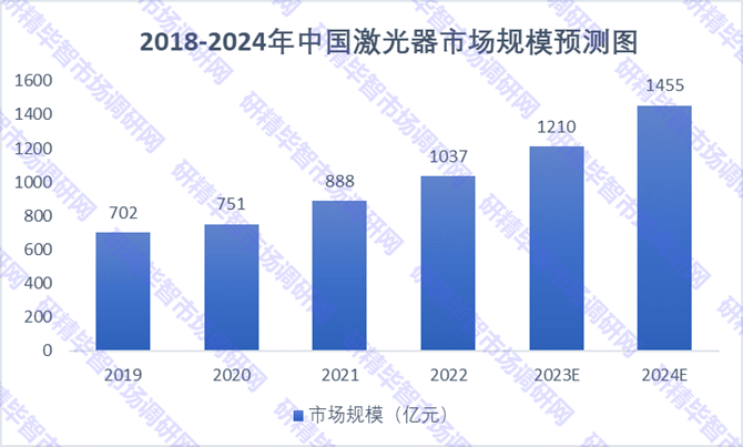 激光器是一種能發(fā)射激光的裝置器件,是激光顯示系統(tǒng)中最為核心的部件。根據(jù)增益介質(zhì)的不同,激光器可分為光纖激光器、半導(dǎo)體激光器、固體激光器和氣體激光器。其中,光纖激光器因高效率、多用途、低維護成本的特點受到下游客戶的青睞。根據(jù)市場調(diào)研的數(shù)據(jù)報告顯示,2022年中國激光器市場規(guī)模達(dá)到1037億元,同比增長16.78%。中商產(chǎn)業(yè)研究院分析師預(yù)測,2024年中國激光器市場規(guī)模增至1455億元。