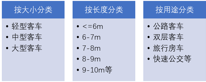 客車是指專門用于運(yùn)輸人員的車輛,通常由底盤、車身和發(fā)動(dòng)機(jī)等組成。這種車輛廣泛應(yīng)用于公共交通、旅游觀光、學(xué)校巴士、企事業(yè)單位班車、旅游包車等領(lǐng)域,且其產(chǎn)品類型繁多,可依據(jù)客車大小、汽車長度、用途、動(dòng)力系統(tǒng)等標(biāo)準(zhǔn)進(jìn)行分類。