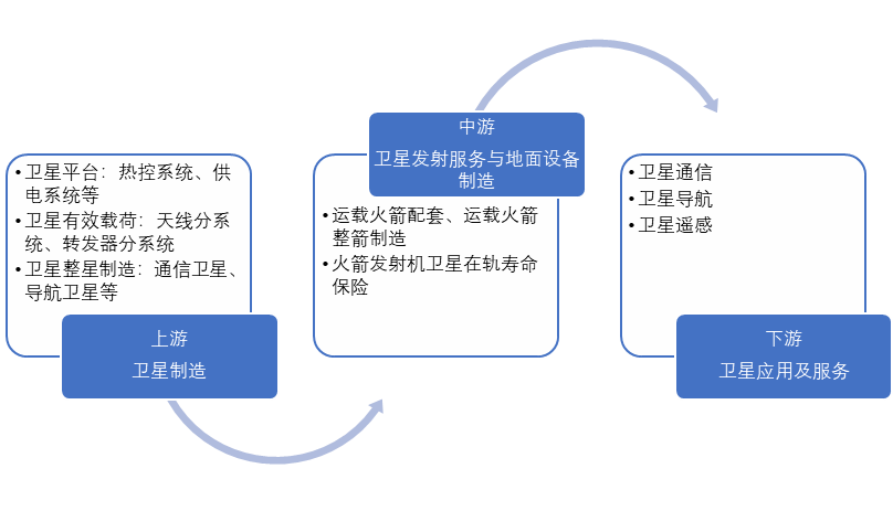 商業(yè)航天產業(yè)鏈上游為衛(wèi)星制造,包括衛(wèi)星平臺、衛(wèi)星有效荷載、衛(wèi)星整星制造;中游包括運載火箭整箭制造、衛(wèi)星地面設備制造、火箭發(fā)射及衛(wèi)星在軌壽命保險等,代表企業(yè)有宇航推進、星河動力、中國人保、中國衛(wèi)星等;下游則為衛(wèi)星應用與服務,包括寬帶、電視直播、交通運輸、氣象觀測等。