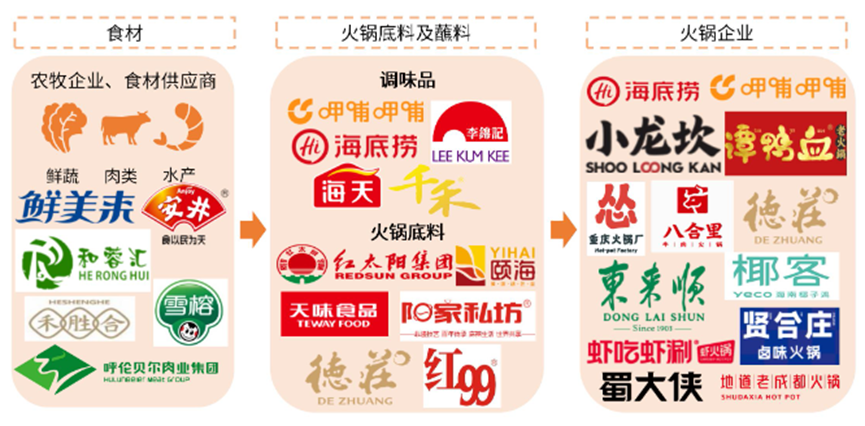 火鍋產(chǎn)業(yè)鏈上游包括火鍋食材原料的生產(chǎn)、加工和倉儲配送環(huán)節(jié),原料包括肉類、海鮮水產(chǎn)、蔬菜水果、辣椒香油等品類。中游環(huán)節(jié)由火鍋調(diào)味料和料制品構(gòu)成,下游環(huán)節(jié)的參與者則為終端消費者?;疱伄a(chǎn)業(yè)鏈鏈路較短,行業(yè)壁壘較低。