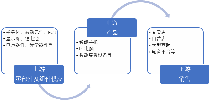 消費(fèi)電子產(chǎn)業(yè)鏈上游為顯示屏、鋰電池、電聲器件、光學(xué)器件、射頻器件、連接器、外殼等組件的供應(yīng),市場(chǎng)主要參與者有深天馬、珠海冠宇、歌爾股份、歐菲光等;中游為產(chǎn)品的組裝及封測(cè)過程,主要包括智能手機(jī)、PC電腦、智能穿戴設(shè)備、TWS耳機(jī)、智能家居產(chǎn)品、汽車消費(fèi)電子等,代表企業(yè)包括華為、聯(lián)想、小米等;下游為產(chǎn)品的銷售環(huán)節(jié),主要的銷售渠道有專賣店、大型商超等。