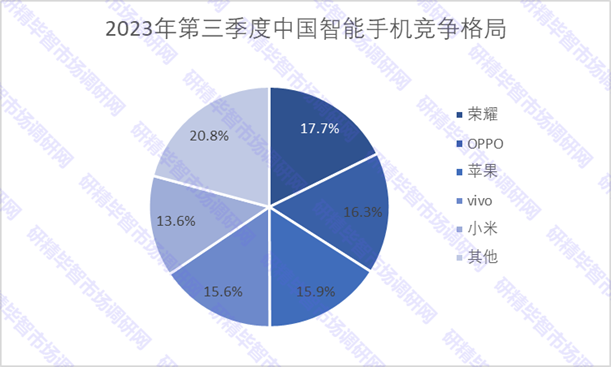 從廠商市場競爭格局來看,2023年第三季度,榮耀以17.7%的市場份額排名國內(nèi)手機(jī)市場第一,OPPO(含一加)以16.3%的市場份額排名第二,蘋果、vivo以及小米分列三四五名,市場份額為15.9%、15.6%和13.6%。