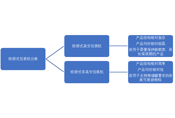 給袋式包裝機指自動完成對預制袋的取袋、打印、開袋、物料計量、充填、封口、輸出等工序的包裝機。按照工作流程的不同,給袋式包裝機可分為給袋式真空包裝機與給袋式非真空包裝機,相較于后者,給袋式真空包裝機多了“將產(chǎn)品裝入包裝容器后,抽去容器內(nèi)部的空氣,達到預定真空度”的工序。