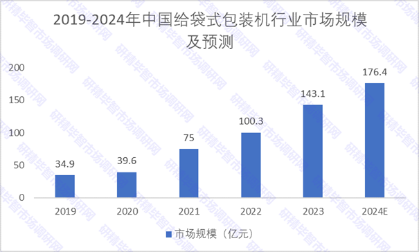 根據(jù)研究報告顯示,中國給袋式包裝機行業(yè)市場規(guī)模由2019年的34.9億元增長至2023年的143.1億元,年均復(fù)合增長率達(dá)42.3%;預(yù)計2028年整體市場規(guī)模有望增長至370.7億元,2024年至2028年年均復(fù)合增長率達(dá)20.4%。其中給袋式真空包裝機市場規(guī)模在總體市場中占比較大。