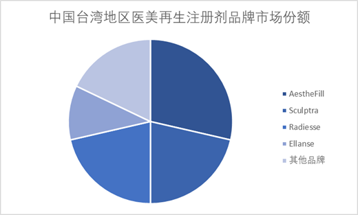 中國臺灣地區(qū)逐步形成以微整形為核心的醫(yī)美產(chǎn)業(yè),除本地消費者外,每年有大量大陸地區(qū)及東南亞部分國家消費者前來注射再生類產(chǎn)品。根據(jù)市場調(diào)研數(shù)據(jù)顯示,目前市場以AestheFill、Sculptra、Radiesse 和Ellanse為主要品牌,其中AestheFill在臺灣地區(qū)的銷售量近年來已超過老牌童顏針Sculptra,以近30%的份額占據(jù)市場第一。
