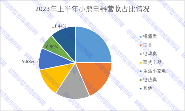 研究報(bào)告顯示,2023年上半年,小熊電器主營(yíng)產(chǎn)品包括鍋煲類、壺類、電動(dòng)類、西式電器、生活小家電、電熱類,占比分別為24.88%、18.67%、15.51%、12.73%、9.88%、6.89%。