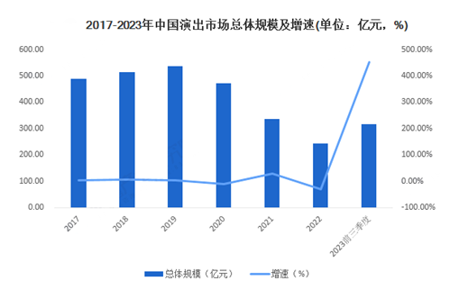 受疫情影響,2022年演出市場總體經(jīng)濟(jì)規(guī)模243.60億元,與2021年同比降低31.33%。2023年前三季度,全國營業(yè)性演出場次達(dá)34.24萬場,較去年同期增長278.76%;演出票房收入315.41億元,較去年同期增長453.74%。