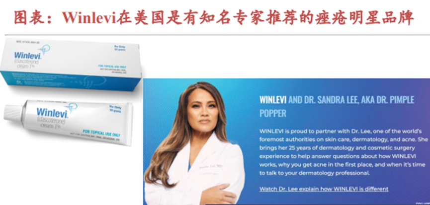 三生制藥引進(jìn)全球首款獲批上市的雄激素受體抑制劑1%克拉考特酮乳膏劑Winlevi,橋接試驗(yàn)近期獲批。Winlevi是首款外用雄激素受體抑制劑,近40年來(lái)FDA批準(zhǔn)的首款具有新作用機(jī)制的外用痤瘡藥物,其外用屬性使安全性大大提升,相對(duì)口服制劑增加了男性患者人群(避免全身吸收引起女性化)。在美國(guó)獲得了知名皮膚科專(zhuān)家PIMPLE POPPER(以擅長(zhǎng)解決皮膚問(wèn)題聞名于網(wǎng)絡(luò))推薦,自2021年12月上市以來(lái)已成為美國(guó)處方量最大的痤瘡治療用藥。