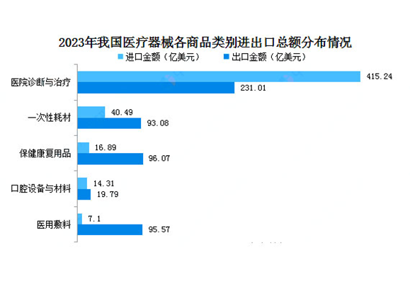 中國康復醫(yī)療器械的進出口情況顯示了該行業(yè)的快速發(fā)展和國際競爭力。從出口方面來看,2023年中國保健康復用品的出口額達到了96.07億美元,超過了670億元人民幣,占比17.94%。這一數(shù)據(jù)表明,康復器械已成為國內(nèi)醫(yī)療器械出口的主力軍,且在國際市場上具有較強的競爭力。特別是在美國市場,國產(chǎn)康復輔具占據(jù)了90%的市場份額,凸顯了中國康復醫(yī)療器械在全球市場的影響力。