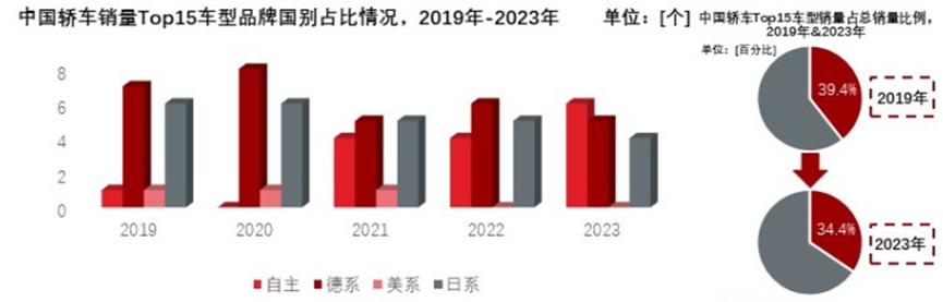 從自主品牌市占率情況看,2019年基本水平維持在18%-20%的水平,而到2024年已經(jīng)在50%附近上下浮動(dòng)。但在2023年的Top15車型榜單,自主品牌以六款車型領(lǐng)跑榜單,而美系車型已經(jīng)連續(xù)兩年沒有任何車型進(jìn)入前十五了。一方面,近年來,自主品牌汽車制造商在技術(shù)研發(fā)和生產(chǎn)工藝方面取得了顯著進(jìn)步,提高了產(chǎn)品的質(zhì)量和可靠性。而另一方面,自主品牌汽車通常具有成本優(yōu)勢,能夠提供更具競爭力的價(jià)格。這對于價(jià)格敏感的消費(fèi)者群體尤其具有吸引力,使得自主品牌在中低端市場尤為受歡迎。隨著自主品牌產(chǎn)品質(zhì)量的提升和品牌形象的建設(shè),消費(fèi)者對自主品牌的認(rèn)知和接受度也在逐漸提高。