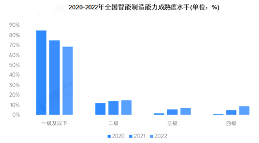 根據(jù)市場調(diào)研的數(shù)據(jù)顯示,2022年,全國制造業(yè)智能制造能力成熟度較2021年有所提升,市場調(diào)研數(shù)據(jù)顯示一級及以下的低成熟度企業(yè)占比減少6個百分點,三級以上的高成熟度企業(yè)數(shù)量增加了5個百分點。