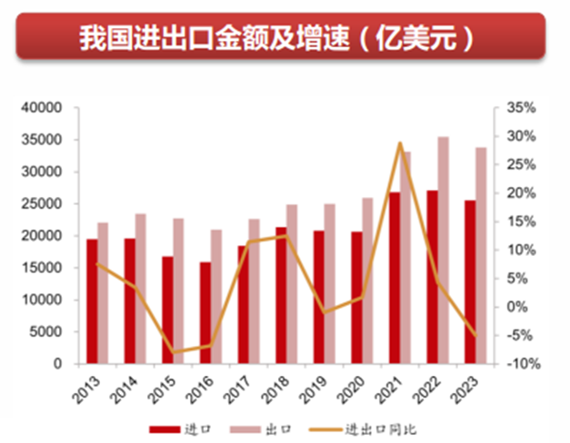 跨境物流屬于現(xiàn)代物流業(yè)的重要細(xì)分領(lǐng)域之一,其發(fā)展?fàn)顩r與進出口貿(mào)易緊密相關(guān)。2024年1月12日國務(wù)院舉行新聞發(fā)布會介紹2023年全年進出口情況。據(jù)市場調(diào)研報告數(shù)據(jù),去年我國進出口總值41.76萬億元人民幣,同比增長0.2%。其 中出口23.77萬億元,增長0.6%;進口17.99萬億元,下降0.3%。以美元計2023年我國進出口總值5.94萬億美元, 同比下降5.0%。其中,出口3.38萬億美元,同比下降4.6%;進口2.56萬億美元,同比下降5.5%。