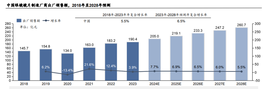 未來(lái),隨著各鏡片生產(chǎn)廠商的生產(chǎn)技術(shù)提升,行業(yè)實(shí)現(xiàn)精細(xì)化生產(chǎn),鏡片產(chǎn)品呈多元化發(fā)展,中國(guó)眼鏡鏡片生產(chǎn)行業(yè)將會(huì)穩(wěn)步增長(zhǎng)。行業(yè)研究本報(bào)告預(yù)計(jì)至2028年,中 國(guó)眼鏡鏡片出廠銷售額將增長(zhǎng)至260.7億元,2023年至2028年期間的年復(fù)合增長(zhǎng)率約為6.5%。