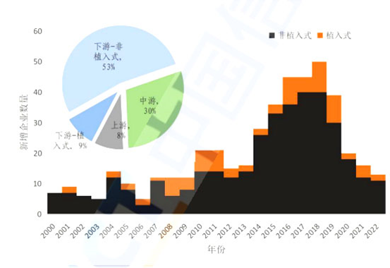 從增長趨勢看,企業(yè)新增速度下降。美國“腦計劃”的啟動時間以2013 年為分水嶺,此時間節(jié)點之后腦機接口技術被業(yè)界看好,全球新增企業(yè)數(shù)量快速增長并持續(xù)到2018 年。2019 年以后受疫情波及, 供應鏈和合作交流一度受限,腦機接口技術應用前景尚不明朗,經(jīng)濟衰退導致投資人投資態(tài)度更加謹慎,輕資產(chǎn)特點的腦機接口企業(yè) 獲得資金渠道受限,部分企業(yè)倒閉以及新增企業(yè)數(shù)量放緩。