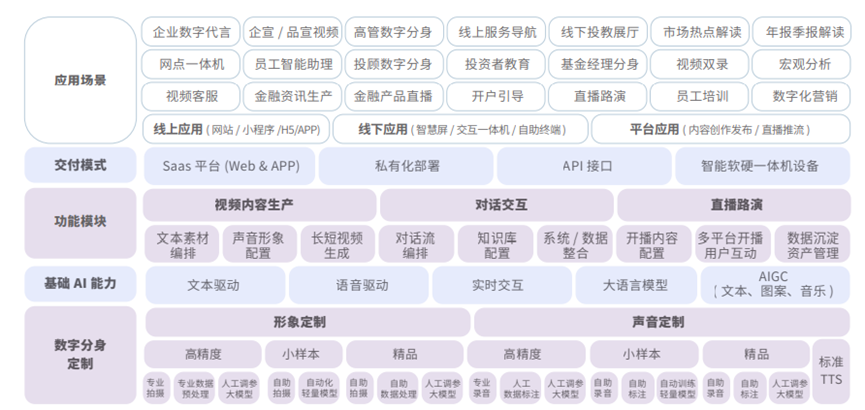 平臺打造了大量場景化的視頻生產(chǎn)模板,并通過AIGC 能力輔助企業(yè)快速生成文案腳本,大幅降低視頻生產(chǎn)門檻。該平臺主要在以下三個方面實現(xiàn)技術(shù)引領(lǐng):1. 完備的人工智能框架能力;2. 超高還原度的數(shù)字人聲形定制;3. 全場景AI 數(shù)字分身能力