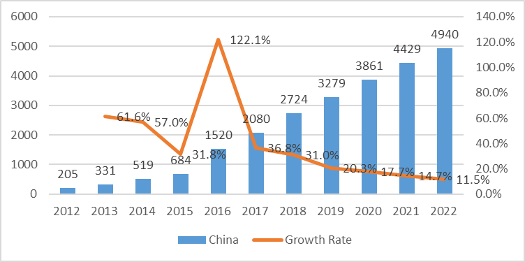 圖:2012-2022年中國工業(yè)機(jī)器人收入(百萬美元)和增長率