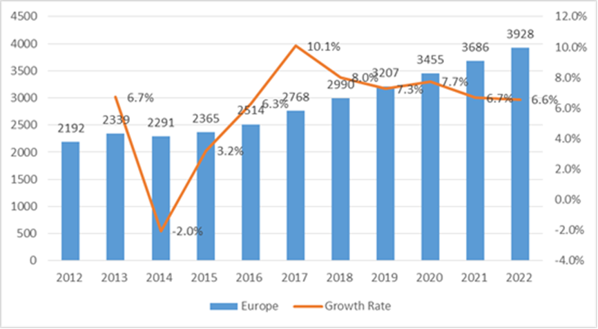 圖:歐洲工業(yè)機(jī)器人收入(百萬美元)和增長率(2012-2022)