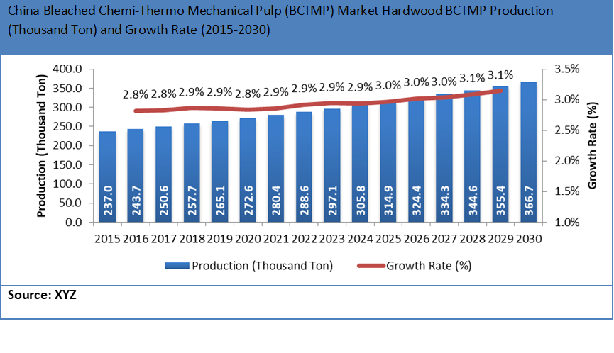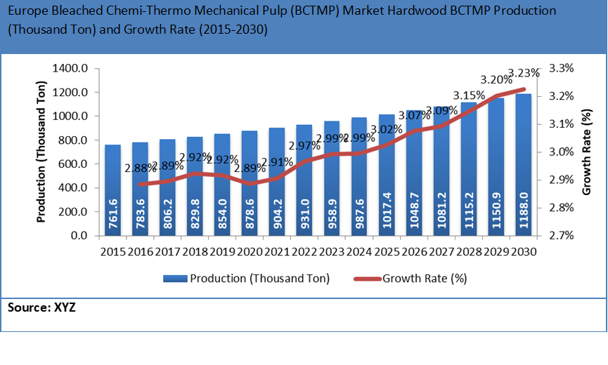 圖歐洲漂白化學-熱機械漿(BCTMP)市場硬木BCTMP產(chǎn)量(千噸)和增長率(2015-2030年)