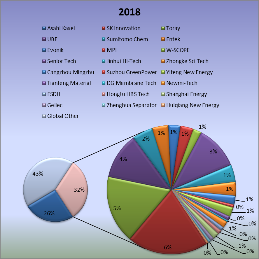 圖:2018年按應(yīng)用劃分的電池隔膜全球生產(chǎn)市場份額