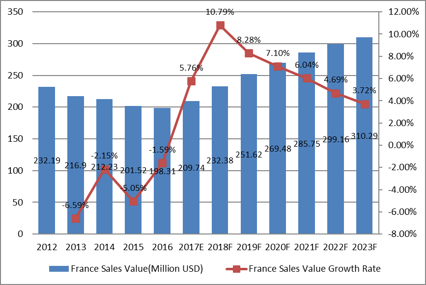 12.2.4法國(guó)松樹(shù)衍生化學(xué)品銷售預(yù)測(cè)(2018-2023年)