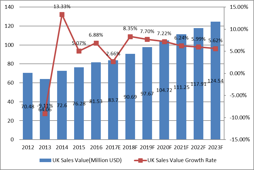 圖:英國(guó)松樹(shù)衍生化學(xué)品市場(chǎng)收入(百萬(wàn)美元)和增長(zhǎng)率(2012-2023年)