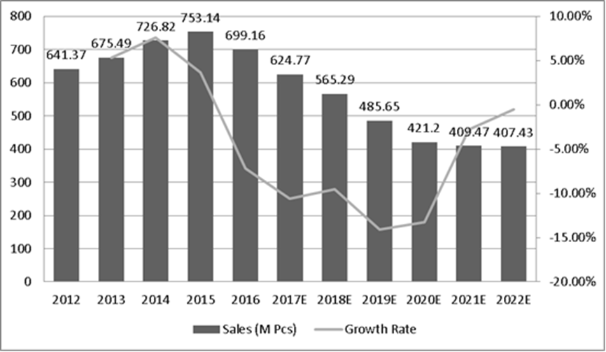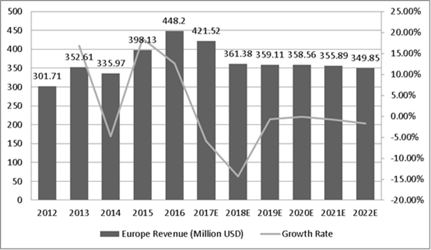 圖:歐洲Micro SD卡膜收入(百萬美元)和增長率(2012-2022年)