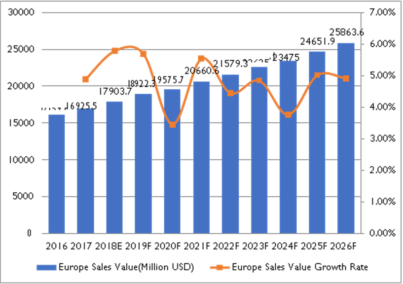 圖:歐洲鍛造收入(百萬美元)和增長率(2016-2026年)