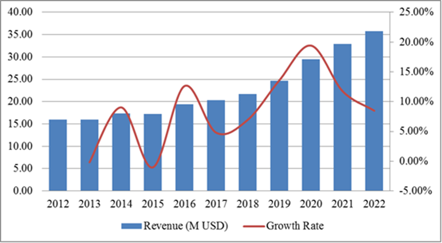 圖:2012-2022年亞太地區(qū)反向自動(dòng)售貨機(jī)收入(百萬美元)和增長率