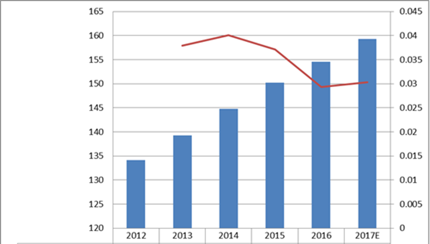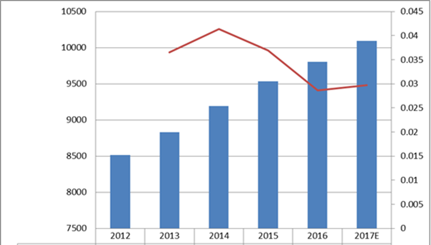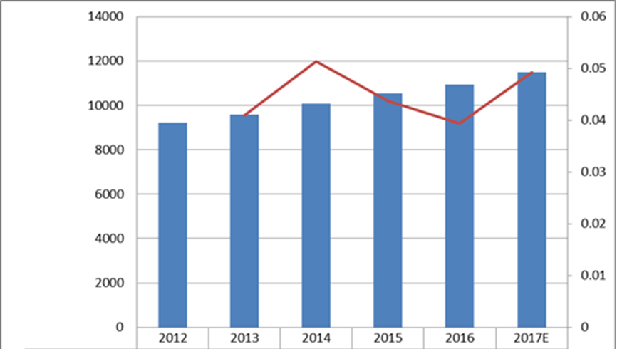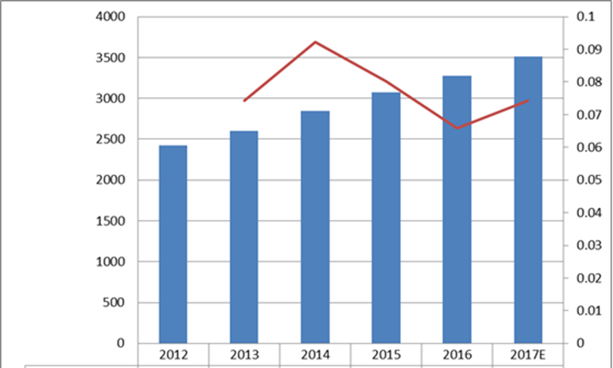 圖:北美空氣粒子計(jì)數(shù)器收入(百萬(wàn)美元)和增長(zhǎng)率(2012-2017年)