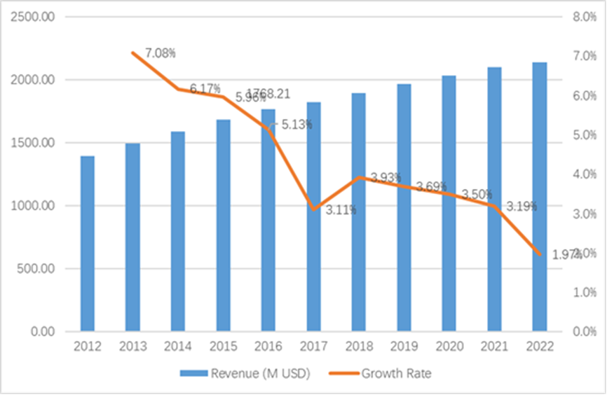 圖:歐洲模板業(yè)營收(百萬美元)和增長率(2012-2022年)