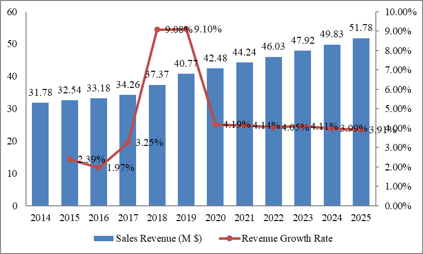 圖:英國導管穩(wěn)定裝置收入(百萬美元)和增長率(2014-2025年)