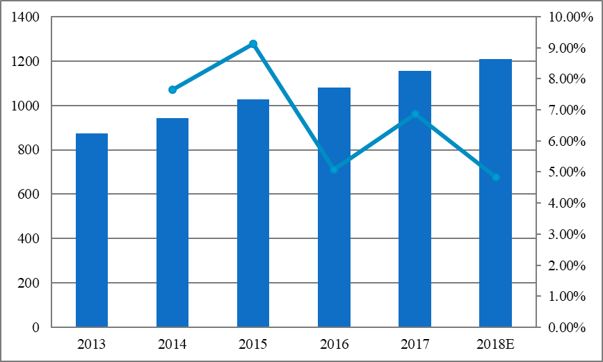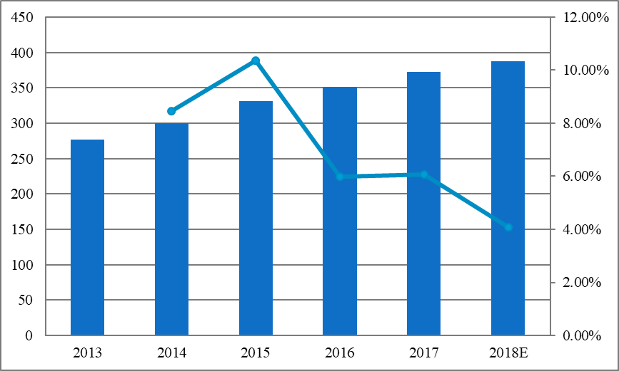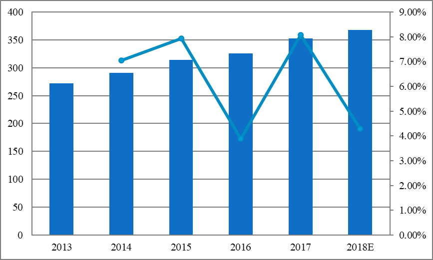圖:2013-2018年中國收入(百萬美元)和增長率