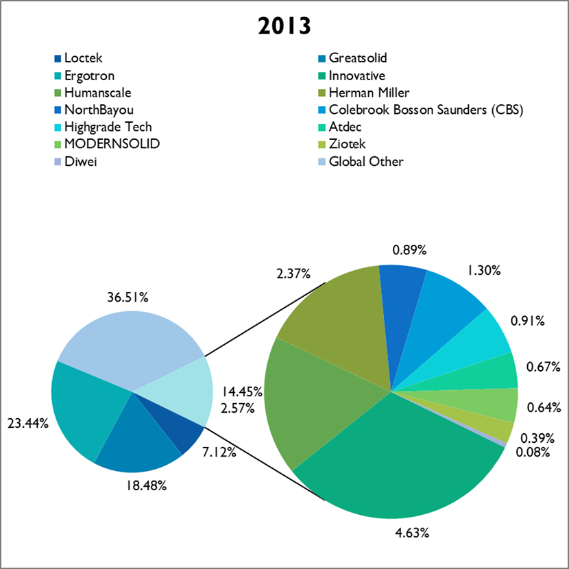 圖:2013年全球液晶顯示器支架市場收入份額(%)