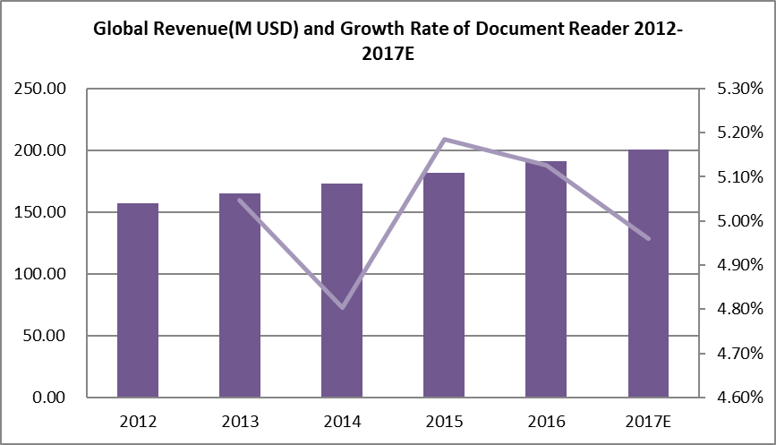 圖:2012-2017年全球文檔讀取器收入(百萬美元)和增長率