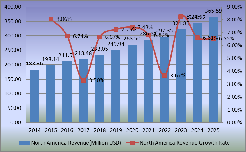 圖:美國廚房刀具收入(百萬美元)和增長率(2014-2025年)