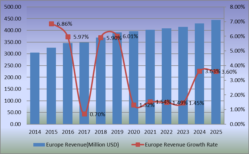 圖:歐洲廚房刀具營收(百萬美元)和增長率(2014-2025年)