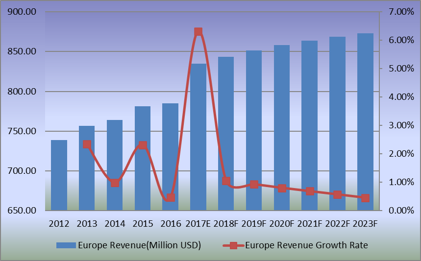 圖:歐洲無(wú)機(jī)鋅化學(xué)品營(yíng)收(百萬(wàn)美元)和增長(zhǎng)率(2012-2023年)
