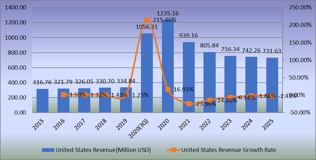 圖:美國隔離服收入(百萬美元)和增長率(2014-2025年)