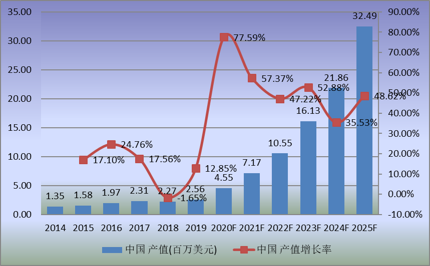 圖:美國市場固體氧化物燃料電池(SOFC)2014-2025年產(chǎn)值及增長率