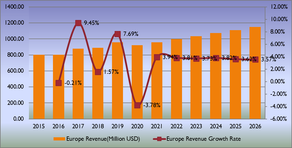 圖:歐洲基于PC的示波器產(chǎn)值(百萬美元)和增長率(2015-2026年)