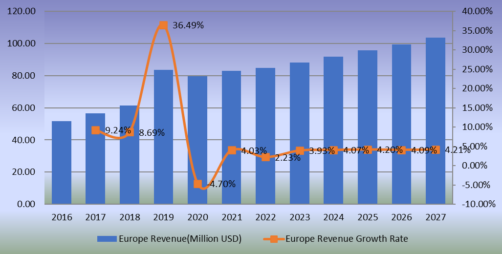 圖:歐洲異噻唑啉酮生物殺滅劑收入(百萬美元)和增長率(2016-2027年)