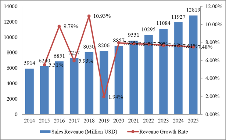 圖:德國冷凍食品產(chǎn)值(百萬美元)和增長率(2014-2025年)